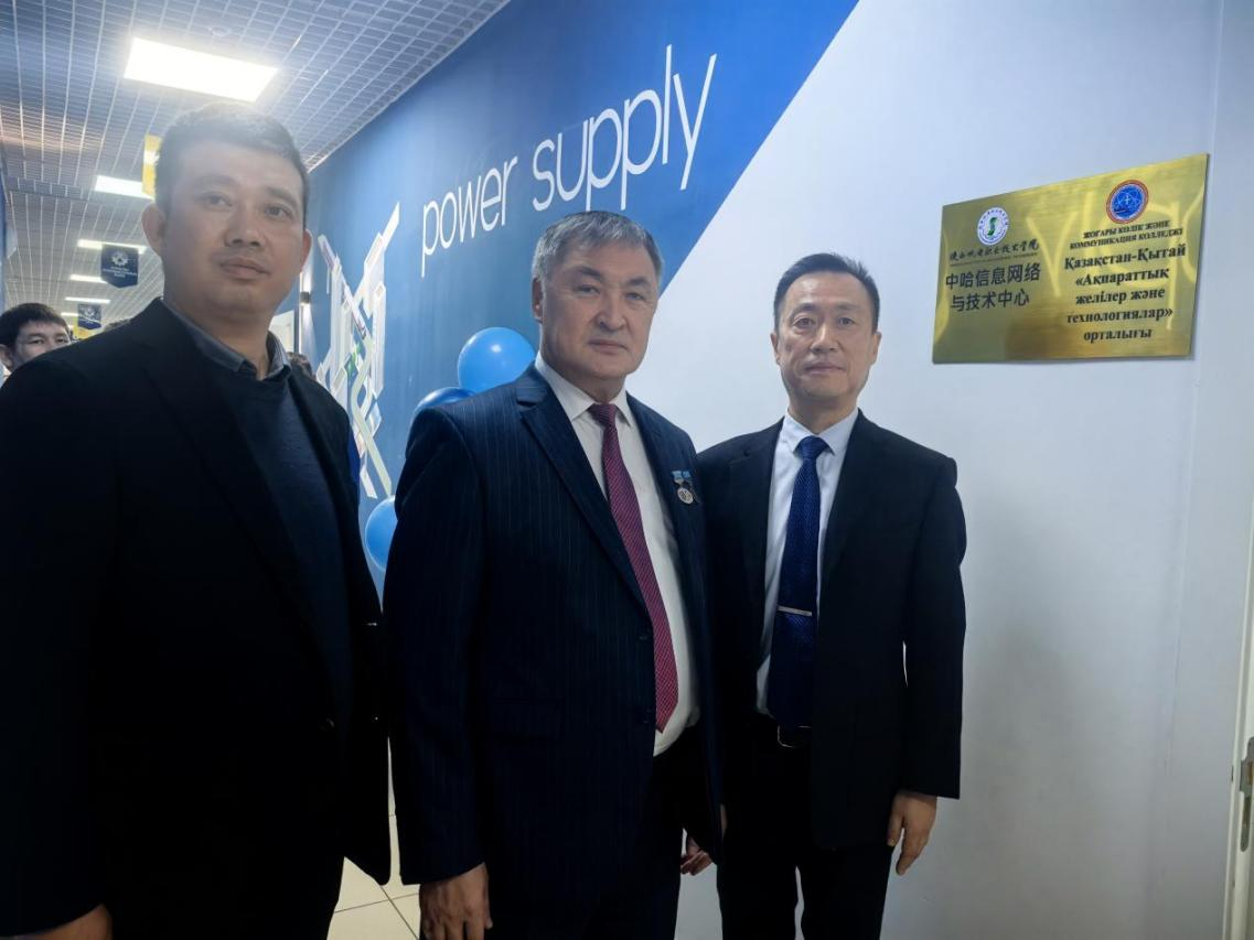 张克与卡佩佐夫·别尔里克·叶尔肯诺维奇为“中哈信息网络与技术学院”揭牌。合作学院将整合双方优势资源,聚焦电子网络与技术信息领域开展深入合作,培养具有国际视野和实践能力的高素质专业人才。随后,代表团一行参观了该校的专业实践教学基地,并就后期学生外出留学实习进行商讨。